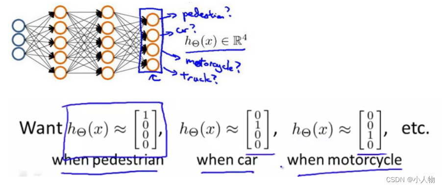 当我们有不止两种分类时(也就是),比如以下这种情况,该怎么办?如果我们要训练一个神经网络算法来识别路人、汽车、摩托车和卡车,在输出层我们应该有4个值。例如,第一个值为1或0用于预测是否是行人,第二个值用于判断是否为汽车。