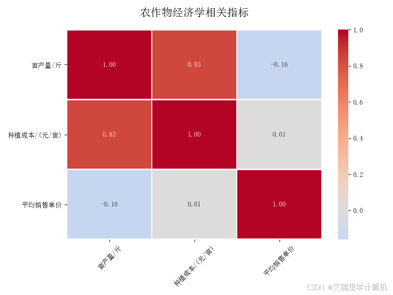 在问题二的基础上,我们进一步分析各种农作物之间的关系和几种条件之间的相关性。首先,我们对第二问得到的预期销售量、销售价格和种植成本进行斯皮尔曼相关性分析,得到变量之间的斯皮尔曼相关性系数。其次,我们引入交叉弹性来量化农作物之间的可替代性和互补性,并建立交叉弹性矩阵获得交叉弹性约束条件。最后,在聚类分析基础上增加交叉弹性约束,得到最优种植方案。