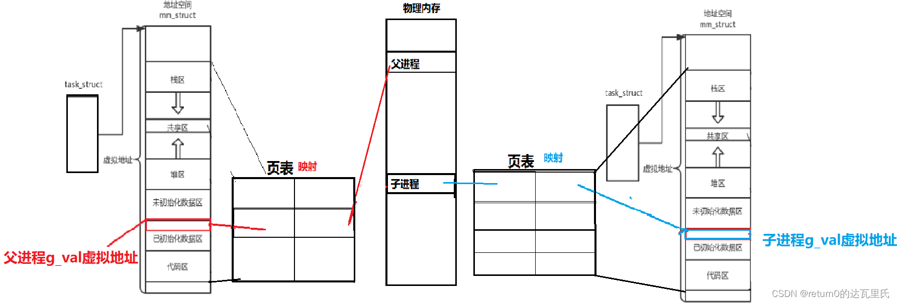 子进程和父进程的g_val的地址都是相同的,很正常.