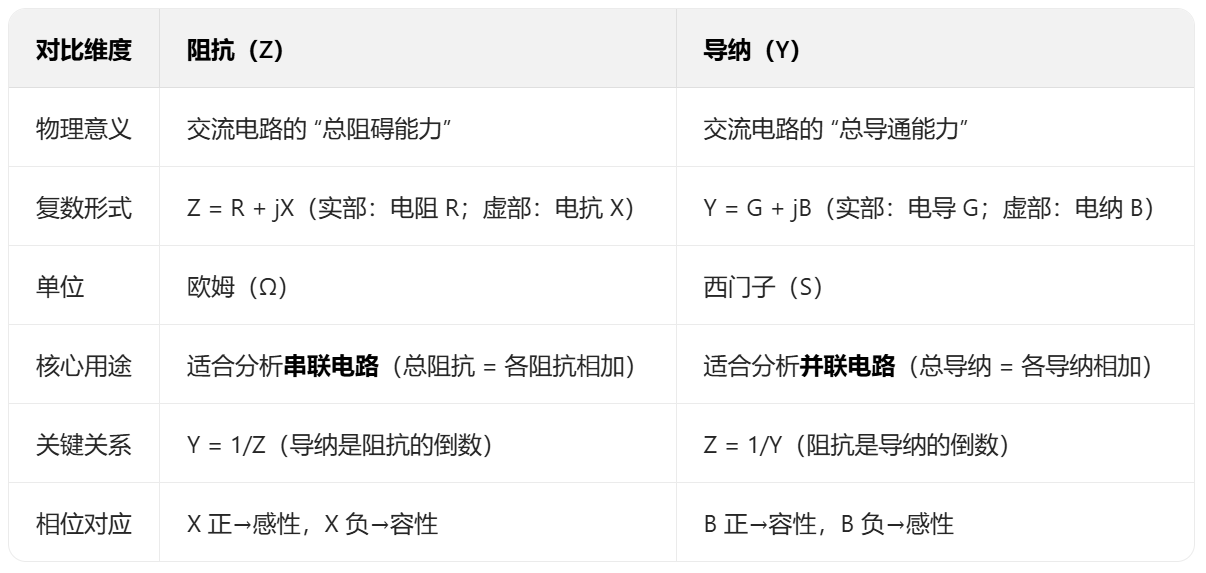 因此,我们需要两个新工具:阻抗(Z) 描述 “电路对交流电的总阻碍能力”,导纳(Y) 描述 “电路对交流电的总导通能力”—— 二者本质是 “阻碍” 与 “导通” 的对立概念,就像 “电阻” 和 “电导(G=1/R)” 的关系。