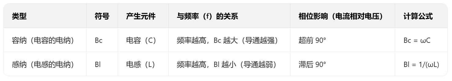 和电抗对应,电纳也分为 “容纳”(电容的导通能力)和 “感纳”(电感的导通能力),特性同样相反: