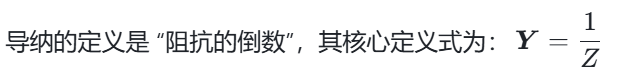 类似上述阻抗的定义,我们将阻抗取倒数可得到导纳的定义。作用是把 “阻碍” 转化为 “导通”,方便并联电路计算(就像直流电路中 “电导” 比 “电阻” 更适合并联计算)。