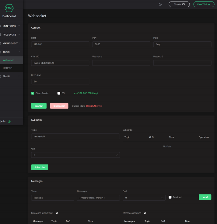 在EMQ X Broker提供的 Dashboard 中 TOOLS 导航下的 Websocket 页面提供了一个简易但有效的WebSocket 客户端工具,它包含了连接、订阅和发布功能,同时还能查看自己发送和接收的报文数据,我们期望它可以帮助您快速地完成某些场景或功能的测试验证: