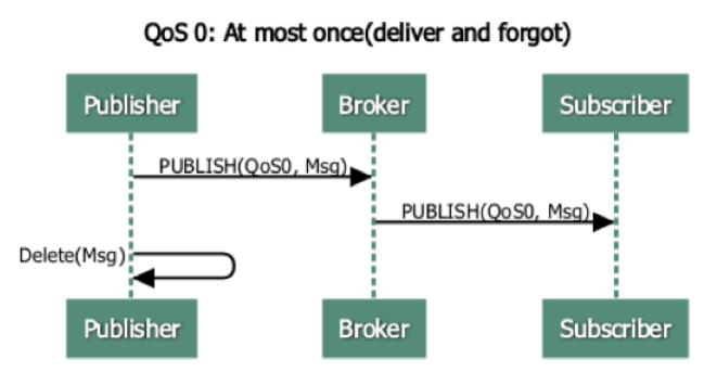 QoS0:"至多一次",消息发布完全依赖底层TCP/IP网络。会发生消息丢失或重复。这一级别可用于如下情况,环境传感器数据,丢失一次读记录无所谓,因为不久后还会有第二次发送。这一种方式主要普通APP的推送,倘若你的智能设备在消息推送时未联网,推送过去没收到,再次联网也就收不到了。