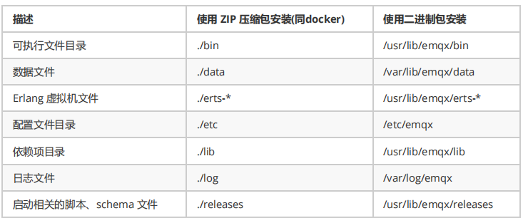 不同安装方式得到的 EMQ X 其目录结构会有所不同,具体如下: