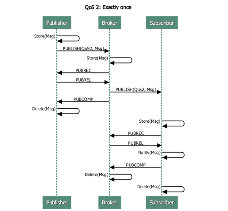 QoS2:"只有一次",确保消息到达一次。在一些要求比较严格的计费系统中,可以使用此级别。在计费系统中,消息重复或丢失会导致不正确的结果。这种最高质量的消息发布服务还可以用于即时通讯类的APP的推送,确保用户收到且只会收到一次。