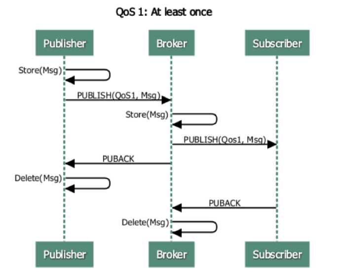 QoS1:"至少一次",确保消息到达,但消息重复可能会发生。