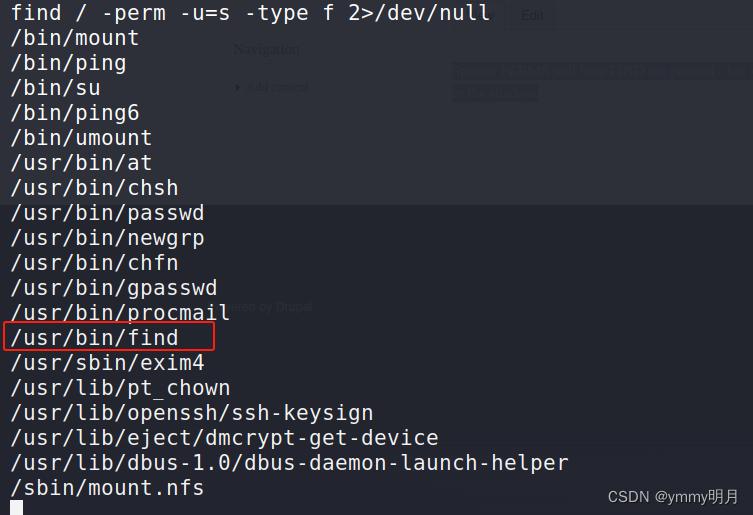 3.find ymmy -exec '/bin/sh' \;:这个命令尝试在 ymmy"目录下执行 /bin/sh 命令。然后,您再次使用了 id 命令来查看当前用户的身份信息,结果显示您以 root 用户身份执行了 /bin/sh 命令。