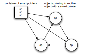 考虑到一种引用关系图:环形引用,如下图例子,3个sp智能指针互相引用,形成一个环形依赖,此时释放container,那么3个sp永远不会被释放,因为他们的被引用计数大于0。C++11引入了weak_ptr用来出来三个sp之间的相互引用,它用来表明引用关系,但是不用于管理对象内存上。