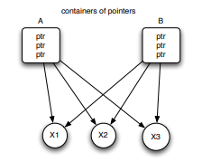 它是一种拥有引用计数的智能指针类型,当引用计数减为0时,真实内存自动被释放。shared指的是ownership拥有权被多个使用者share。比如说下图,A container和B container同时分享了对象X1,X2和X3的拥有权,当A container移除X1的拥有权时,我们需要检查X1内存是否能被释放,取决于X1的使用者是否为0,在这个例子中需要考虑Container B是否还有在使用X1.