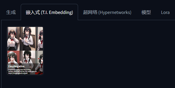 使用嵌入式模型时,你只需点击相应的卡片,它就会自动出现在反向提示词内。这样,你就可以更加专注于创作的核心部分,而不必担心细节上的失误。