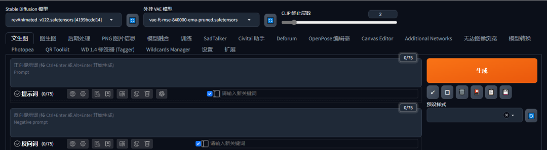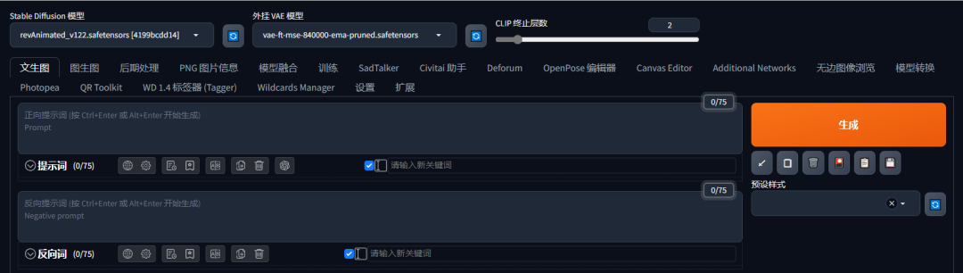 这里就是SD主要的输入界面了,虽然有一堆选项,但是我们真正用来出图的一般就是【文生图】和【图生图】两个选项,其他的都是一些辅助和设置。