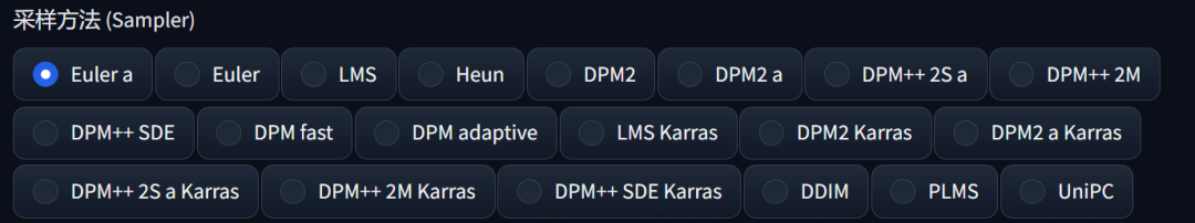 **②采样方法:**代表不同的作画方式,这也是绘画零基础的人需要掌握的知识之一。SD提供了很多采样方法,给我们提供了多种场景的适配算法,每个采样方法都有它擅长的图像生成场景。