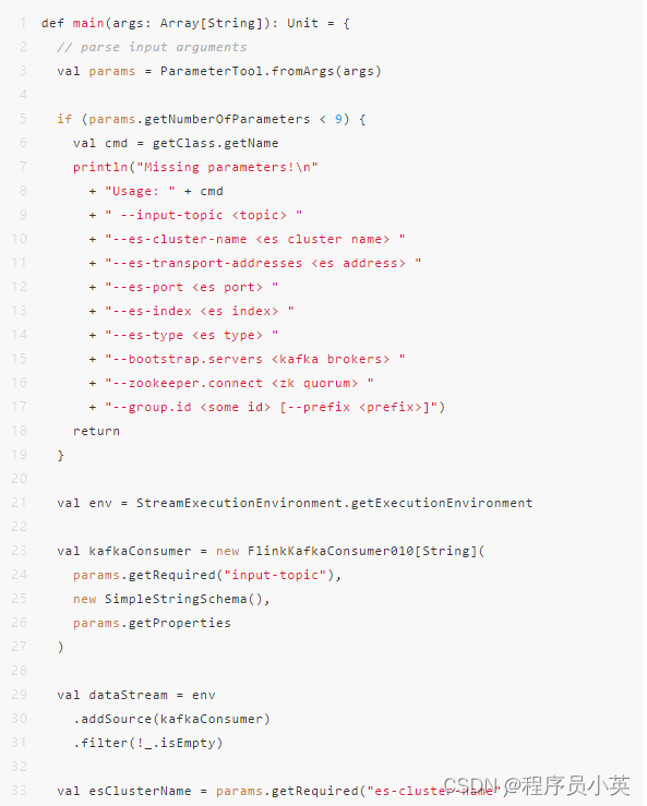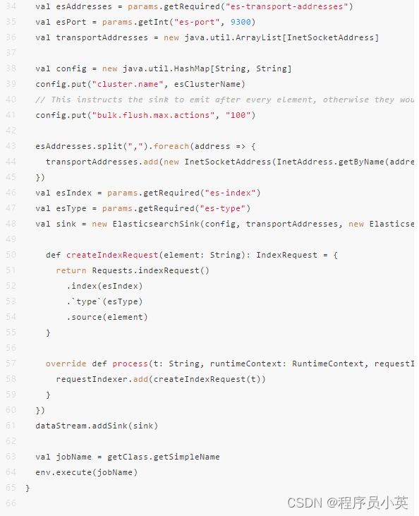 我们使用Flink Streaming API来实现将流式数据处理后,写入到Elasticsearch中。其中,输入数据源是Kafka中的某个Topic;输出处理结果到lasticsearch中,我们使用使用Transport API的方式来连接Elasticsearch,需要指定Transport地址和端口。具体实现,对应的Scala代码,如下所示: