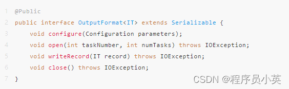 Flink批式处理模式,运行Flink Batch Job时作用在有界的输入数据集上,所以Job运行的时间是有时限的,一旦Job运行完成,对应的整个数据处理应用就已经结束,比如,输入是一个数据文件,或者一个Hive SQL查询对应的结果集,等等。在批式处理模式下处理数据的输出时,主要需要实现一个自定义的OutputFormat,然后基于该OutputFormat来构建一个Sink,下面看下OutputFormat接口的定义,如下所示: