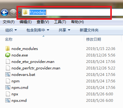 假设,我把nodejs的安装根目录设置为F:\nodejs。那么,安装完毕后,我们看到该目录下有这些文件