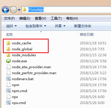 第一步,在“F:\nodejs”目录下创建“node_global"和”node_cache"2个子目录。
