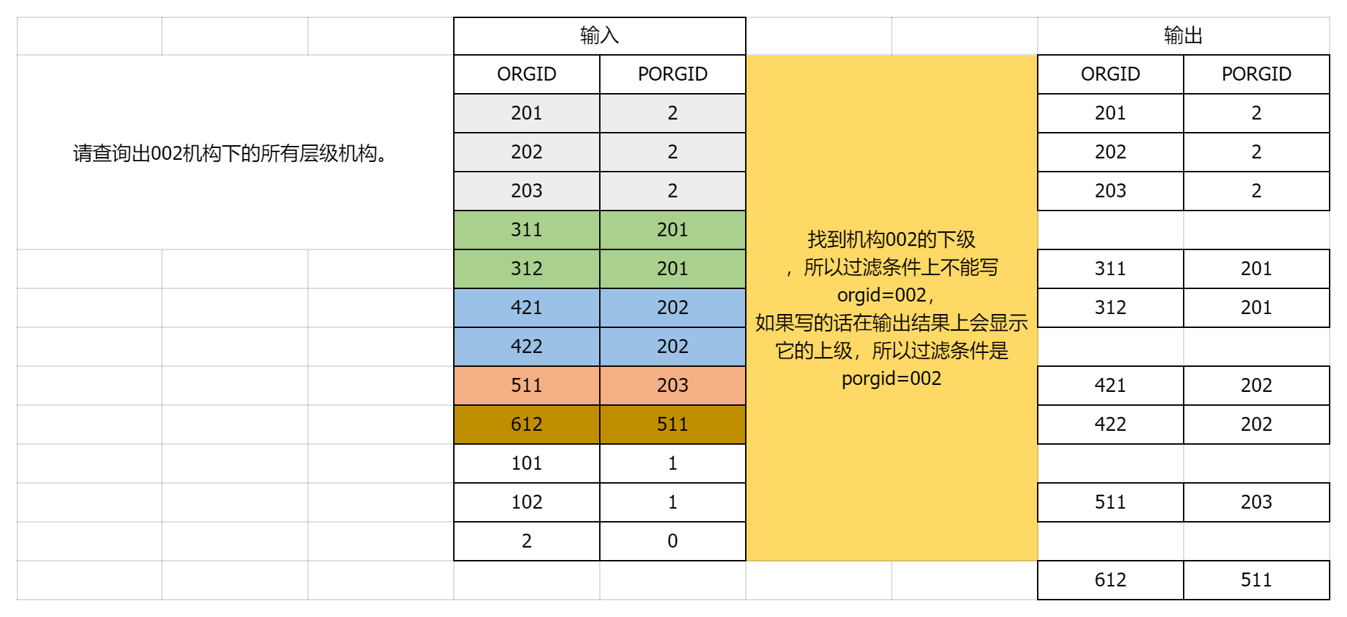 初始查询:找到所有 PORGID = '002' 的记录(即直接下级)。