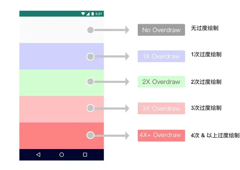 过度绘制 会导致屏幕显示的色块不同,具体如下