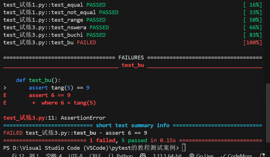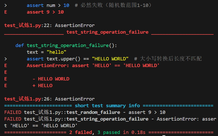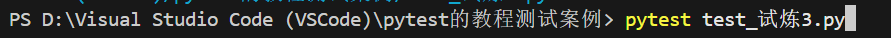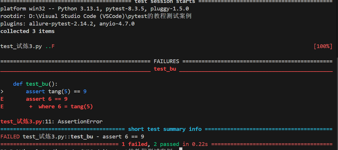我创建的文件是test_试炼3.py。结果中它找到了3个用例,其中一个错误,两个正确。F代表测试失败,点(.)代表测试成功。各位也可以在终端执行 pytest test_试炼3.py -v 在特定的文件执行测试。