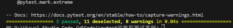 要点:要使用标记,我们必须在测试文件中导入pytest模块。 我们可以为测试定义自己的标记名称,并运行具有这些标记名称的测试。( @pytest.mark.<markername> )。要运行标记的测试,我们可以使下语法(pytest -m <markername> -v)