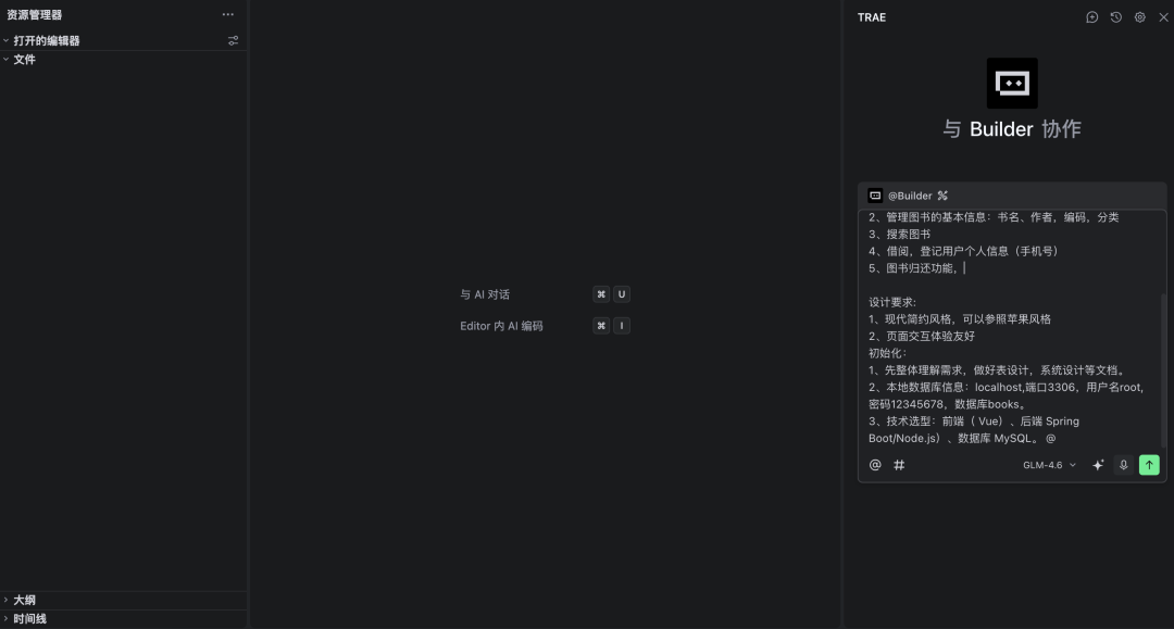 我们使用 Trae 内置的 GLM-4.6 做一个:图书借阅网站。