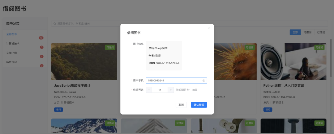 请编写一个图书借阅网站,实现图书的借阅功能。需要包含完整的前端和后端代码,要求项目自测通过,可以正常运行。