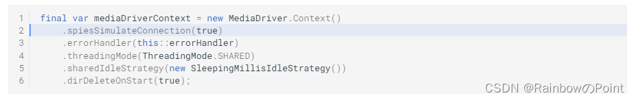 Aeron:基础示例 第 1 行指定和Subscriber进行通信的channel,基于 Aeron URL 方式定义,本例中的channel为 IPC channel,另请参阅的内容。第 2 行指定要通过发送的信息。第 3 行指定了要使用的空闲策略,在本例中,空闲轮询时,SleepingIdleStrategy会将线程停等 1 us,默认值。第 4 行提供了一个堆外的不安全缓冲区,用于保存要发送的信息,为简单起见,分配了 256 字节,当然也可以减少。