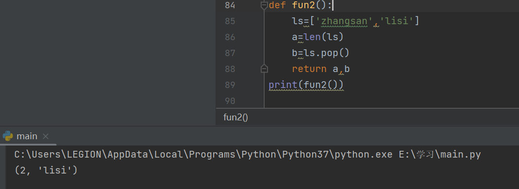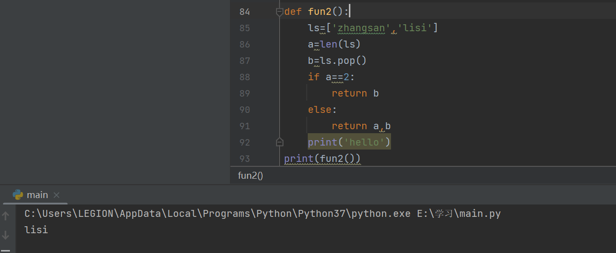 (注意:return语句返回调用函数时表示函数已经执行结束,将不会继续执行return后面的语句)例如该代买中倒数第二行的print()语句并没有输出内容