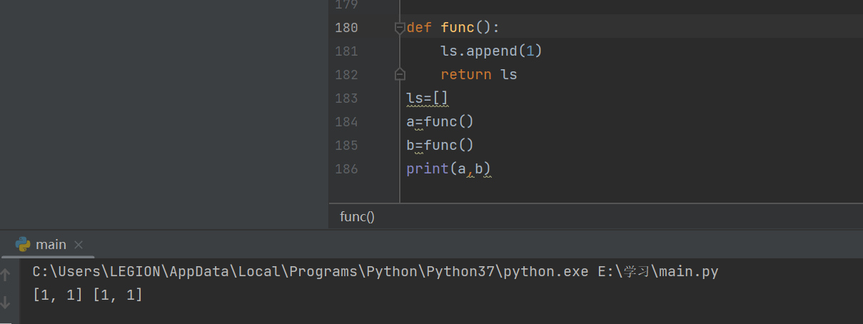 过程:先变成a=[1],之后是b=[1,1],最后a指向全局列表ls,而ls在二次调用后已经变成[1,1],所以a和b最终都是[1,1]