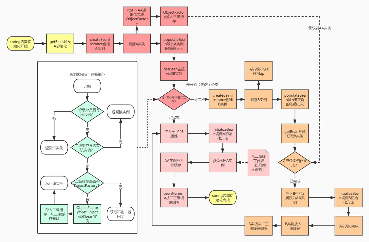将会把二级缓存中的AA直接返回,这是就能保证B中注入的AA实例与spring管理起来的最终的AA实例是同一个了。