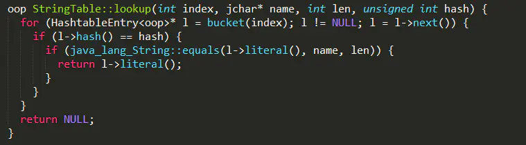 4、StringTable::lookup方法判断StringTable指定位置的桶中是否存在相等的字符串,实现如下: