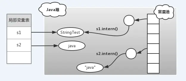 1、对于变量s1,常量池中不存在"StringTest",所以s1.intern()和 s1都是指向Java堆上的String对象;