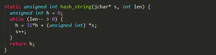 2、java_lang_String::hash_string方法计算出字符串的hash值,实现如下: