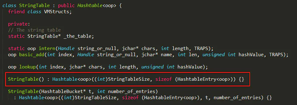 StringTable最终继承了BasicHashtable,通过构造方法参数指定常量池的大小StringTableSize,默认为1009,StringTableSize定义在globals.hpp文件中: