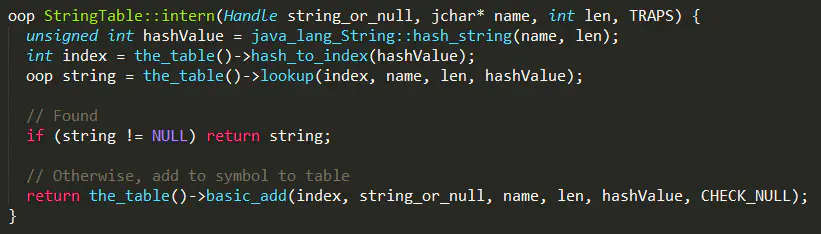 lookup方法通过遍历HashtableEntry链表,如果找到对应的hash值,且字符串值也相等,说明StringTable中已经存在该字符串,则返回该字符串引用,否则返回NULL;