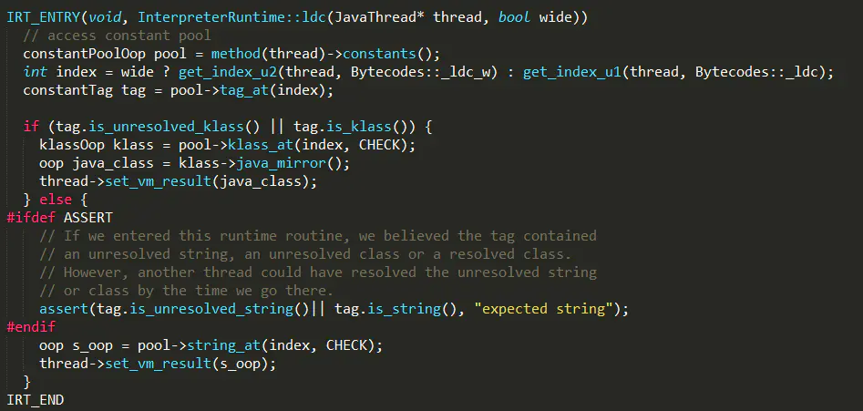 其中ldc指令的实现在interpreterRuntime.cpp文件中,实现如下: