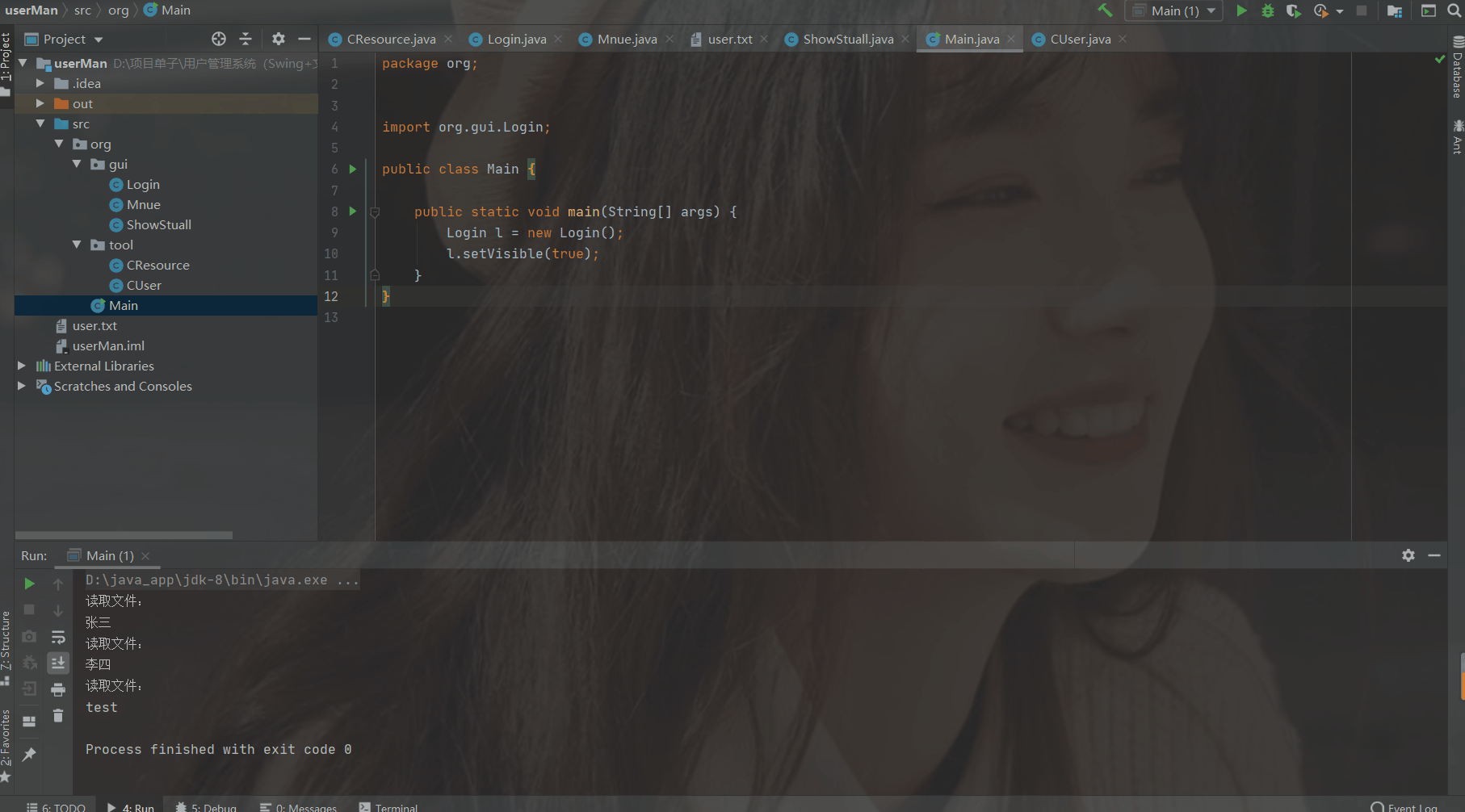Java课程设计:基于Java+Swing+文件存储的用户管理系统(内附源码) 用户管理系统,包括对用户的增加、删除、修改用户密码、查看所有用户信息等功能,并且本次课设要求不涉及数据库,采用文件输入输出流对象、对象序列化保存。首先我们需要选用一个数据结构来保存所有用户的信息,我选择Java中自带的数据结构ArrayList,因为目前看来课设的用户量大小不定且量不会太多,ArrayList可以动态的变化自己大小,且用户量小使用ArrayList操作也更加方便,如果用户量比较大可以考虑选用链表进行存储。