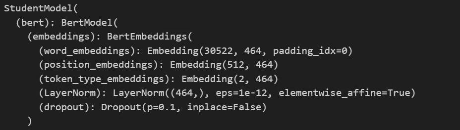 如上图所示是实际构建模型的结构,其嵌入层维度是464,词汇表大小是30522。