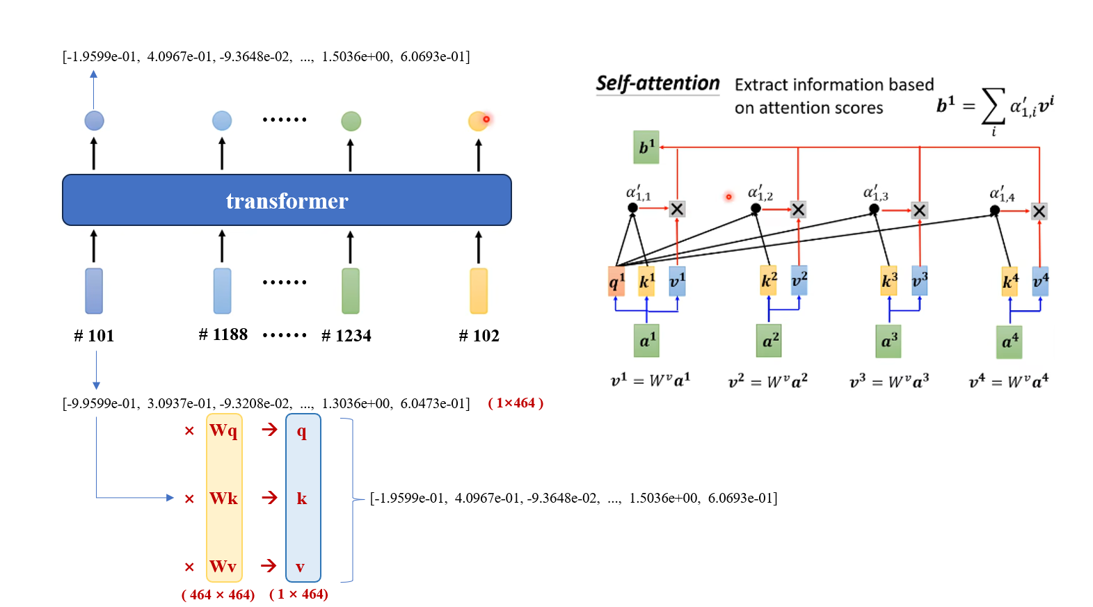一句话(10,464),每个token对应输入,每个token的维度是464;输入后,会进行自注意力的计算,得到最后融合了其他信息的数据,最后得到维度不变的输出。(这里就不详细讲解qkv的计算了)
