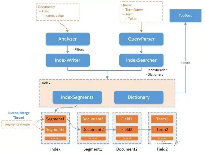 在Lucene中,分为索引(录入)与检索(查询)两部分,索引部分包含 分词器、过滤器、字符映射器 等,检索部分包含 查询解析器 等。