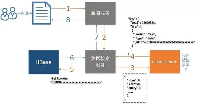 **1、**ES仅提供字段的检索,仅存储HBase的Rowkey不存储实际数据。