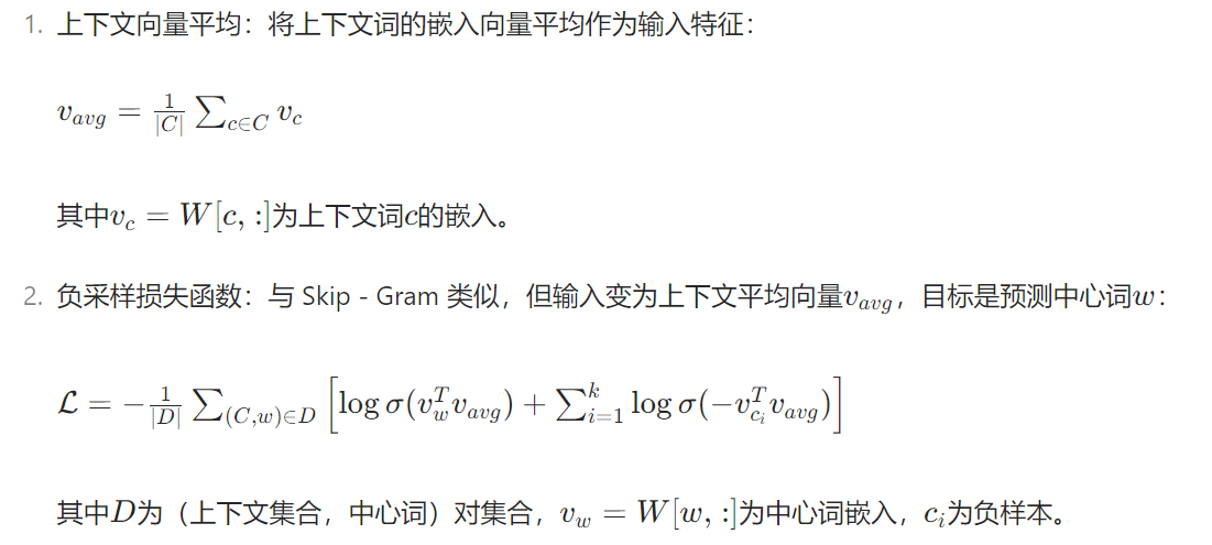 Skip - Gram | 中心词→上下文 | 对低频词更友好,语义捕捉更精准 | 训练速度较慢 |
