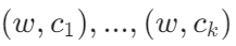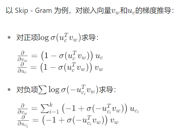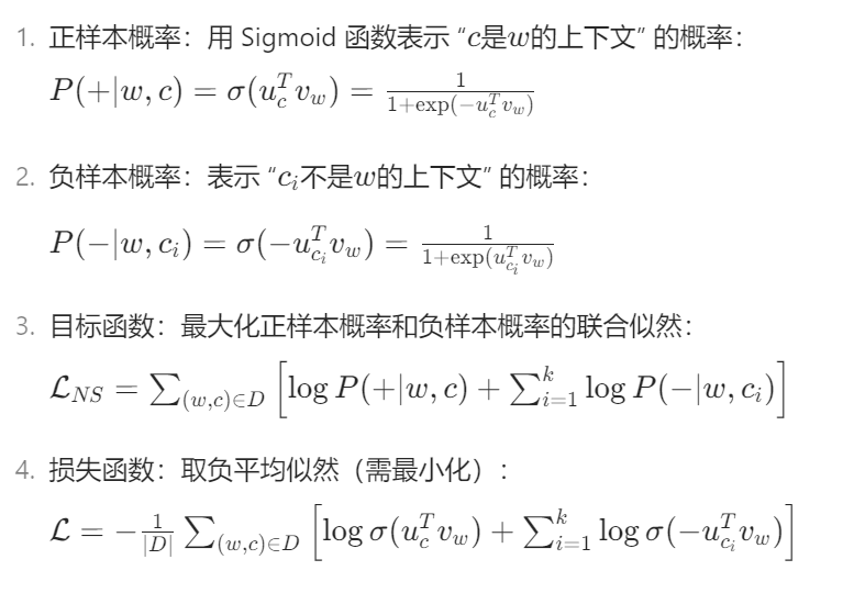 - 对每个正样本(w,c)(真实上下文对),采样k个负样本