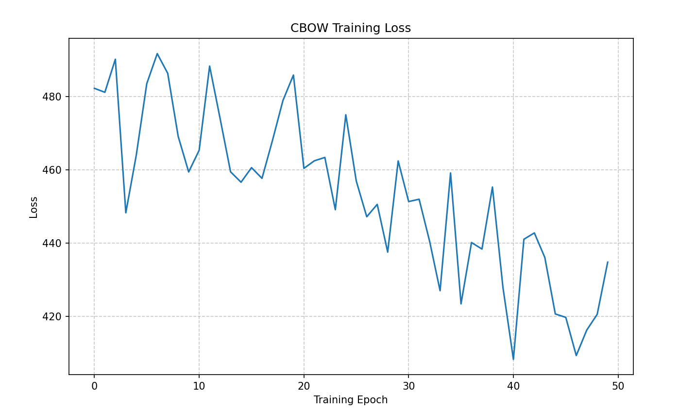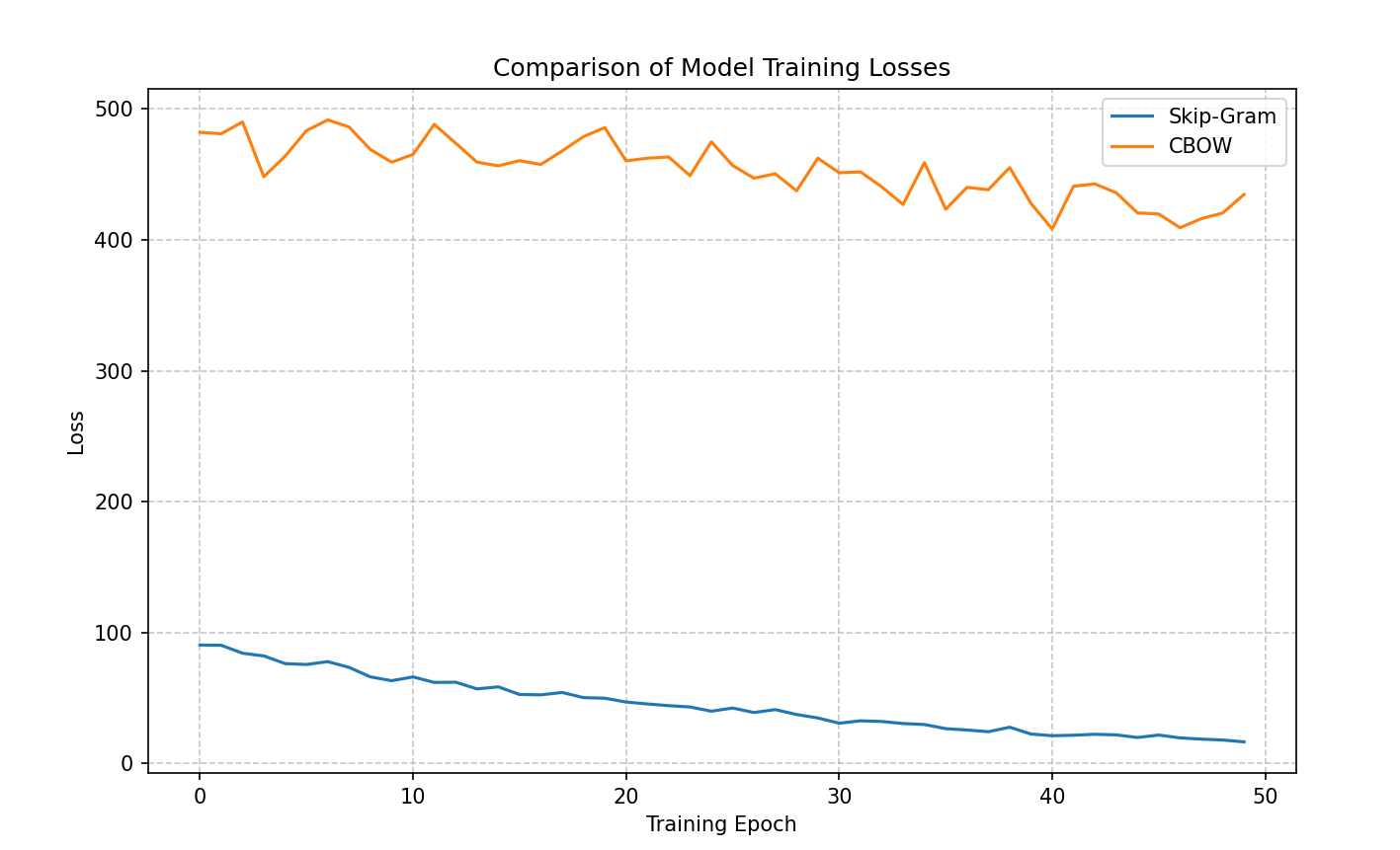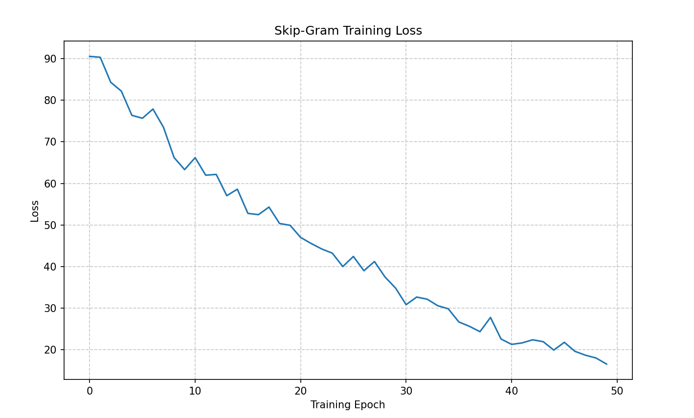 两种模型均通过负采样解决了传统 Softmax 的计算瓶颈,使大规模词向量训练成为可能。词向量的质量可通过损失曲线(Visualizer.plot_loss