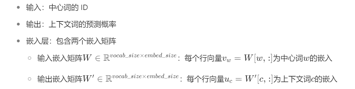 Skip - Gram 模型的任务是:给定中心词w,预测其周围的上下文词c。
