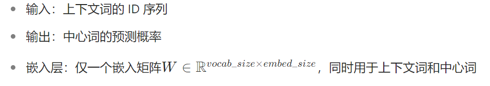 CBOW(Continuous Bag - of - Words)模型的任务是:给定上下文词集合C,预测中心词w。