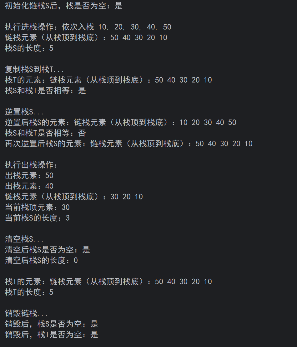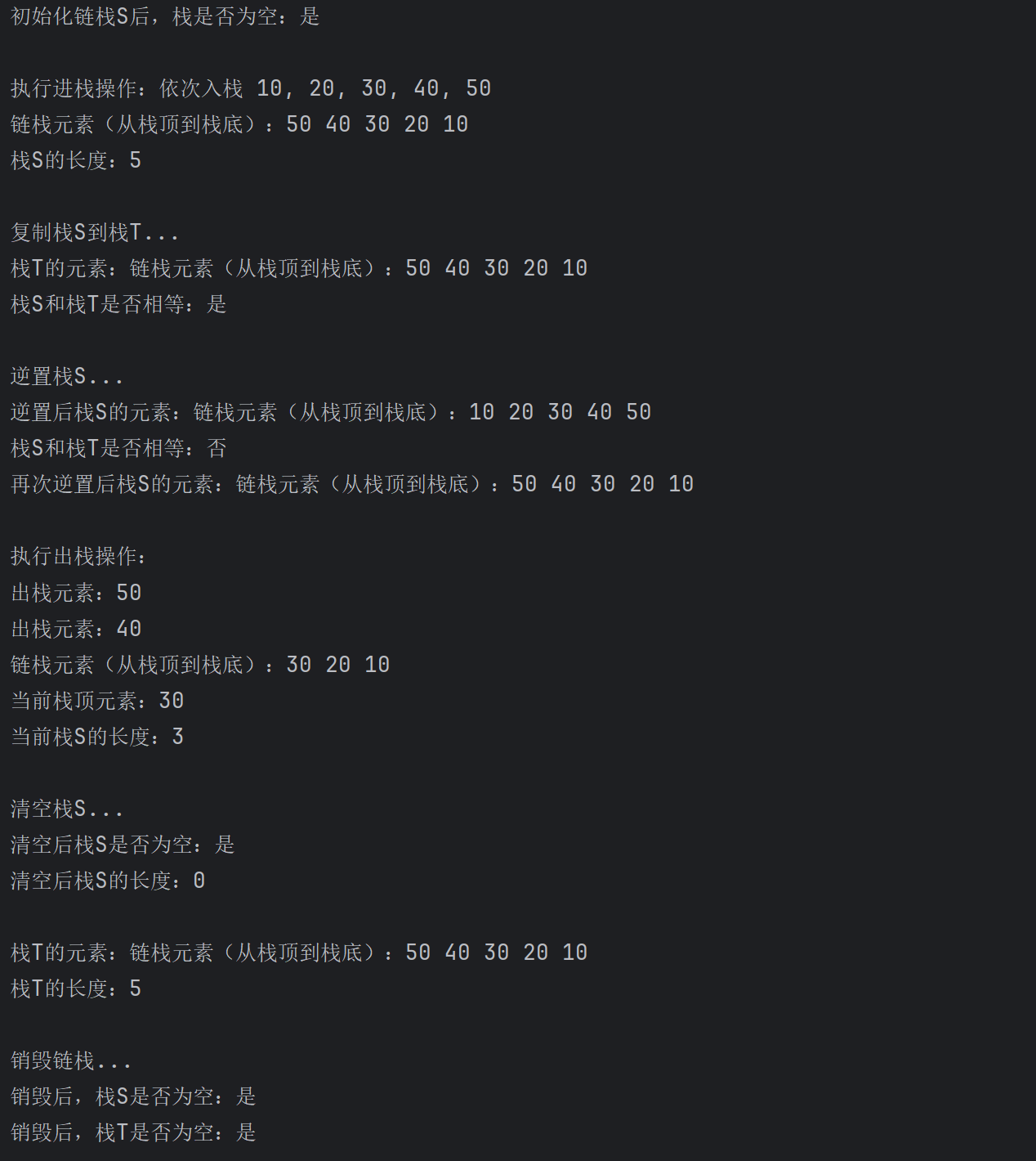 - 空间复杂度:O (1)(仅创建一个新节点)注意:进栈是链栈的核心操作,利用链表头部插入的特性实现,效率极高。