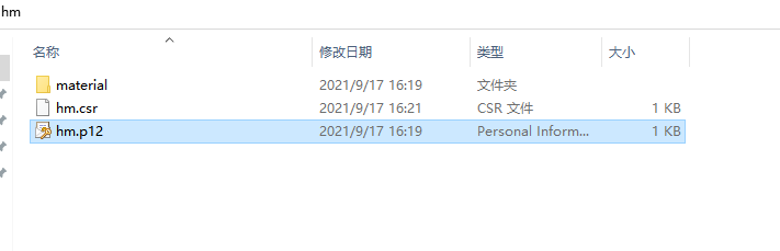 - 点击Finish后,可以在存储路径下获取生成的密钥库文件(.p12)和证书请求文件(.csr)
